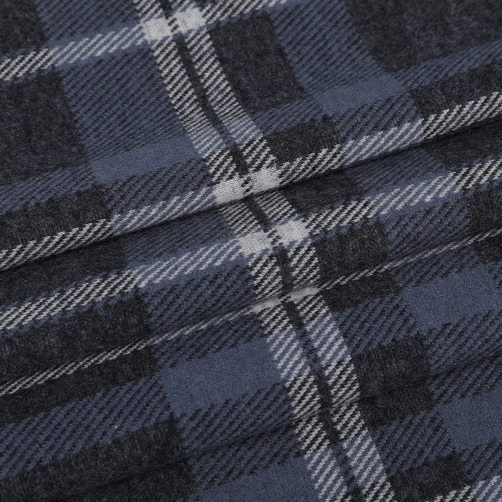 Double-sided Jacquard Soft and comfortable Wool Silk Plaid Knitted fabric is made of selected raw materials through fine proportioning and advanced technology. The fabric composition is 50% wool, 30% spun silk, and 20% cotton. This scientific ratio ensures that the fabric maintains good thermal insulation performance while also having good breathability and comfort. As the main component of the fabric, wool provides good warmth and breathability, allowing the fabric to remain comfortable in cold environments. The addition of spun silk significantly improves the gloss and smoothness of the fabric, and at the same time enhances the softness and skin-friendliness of the fabric, making the wearing experience more pleasant. The addition of cotton further improves the durability and hygroscopicity of the fabric, ensuring it remains dry and comfortable after long-term wear. The double-sided jacquard process is a highlight of this fabric. Through precision weaving technology, both the front and back sides present a delicate and uniform plaid pattern, which not only improves the visual effect of the fabric but also increases the layering and three-dimensionality of the fabric. This unique process allows the fabric to show rich light and shadow changes when exposed to light, enhancing the fashion sense and ornamental value of the fabric.